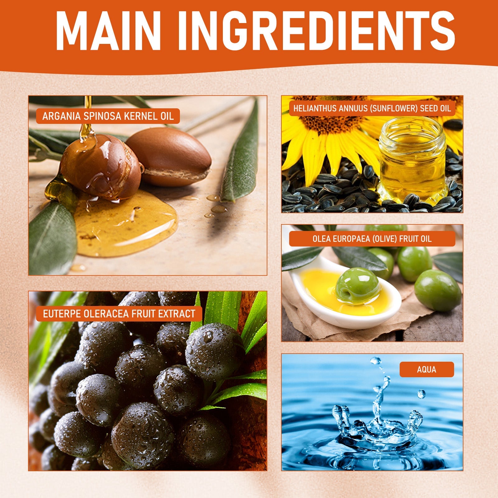 Our Protectant Leave-In Spray contains rgania Spinosa Kernel Oil, Euterpe Oleracea Fruit Extract, Helianthus Annuus (Sun-Flower) Seed Oil.. It can reduce scalp damage, enhance hair elasticity, and make the scalp healthier. It's easy to apply: just spray the spray onto your hair and gently brush it. After use, it can keep the hair young and charming, and feel smooth and light. You can enjoy complete hair care, smooth hair surface, and easily control hair frizz.
